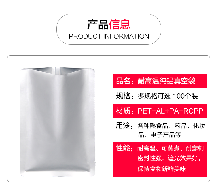 • 耐高溫水煮殺菌純鋁箔真空袋蒸煮袋